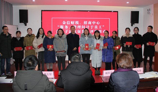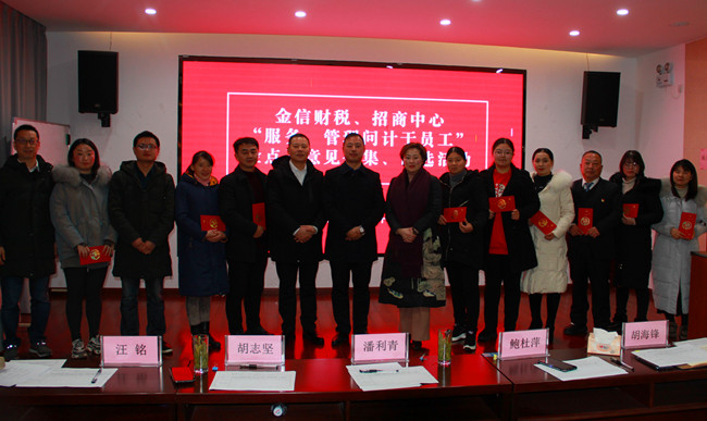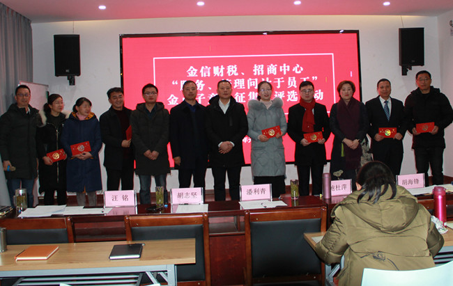 1月18日,招商中心、金信財稅召開“金點子”評選大會,并專門聘請縣經濟開發區副主任潘利青、縣投資促進局副局長鮑杜萍、縣科技商務經濟信息化局副局長胡志堅等三位領導作為評委參與評選,金信財稅全體員工50余人參加了大會。