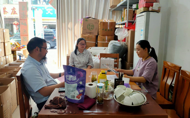 [上圖為胡曉紅副經理與會計方智敏在與黃山市歙縣仰坦精制花茶廠經理江健進行面對面溝通交流。]