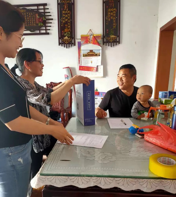 [上圖為上圖為財稅部李霞娟經理走訪黃山權敢勞務有限公司經理王連生并送上感恩禮包。]