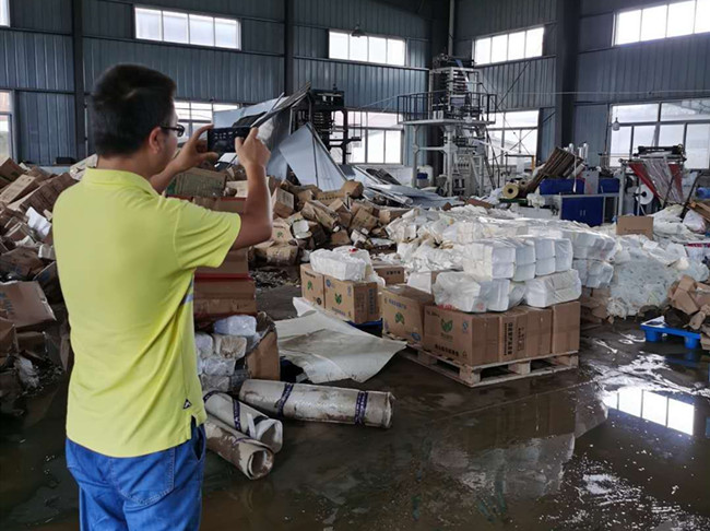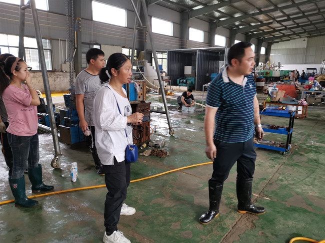 (上圖為公司會計柯淼在嘉達塑膠公司車間了解受災情況。)