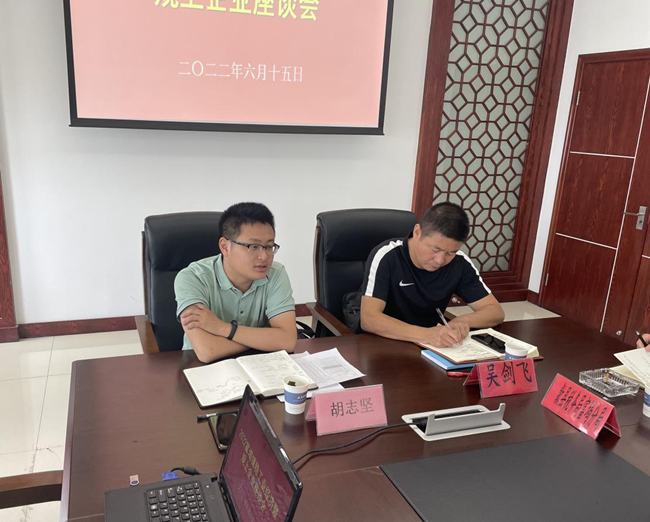 6月15日,2022富堨鎮穩工業經濟暨規上企業座談會在我中心召開富堨鎮黨委書記吳劍飛、鎮長許永山、副鎮長梅松立以及歙縣稅務局富堨分局負責人參加會議。縣科技商務經濟信息化局副局長胡志堅應邀參會并作指導講話。黃山科宏生物香料黃山杰普特凱旋工貿金仕特種包裝十余家企業負責人參加座談