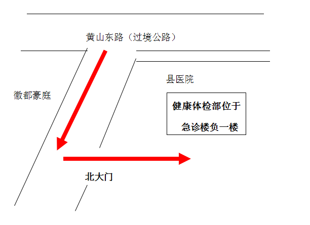 一、健康體檢部位置(線路1:不要上醫院平臺,沿著縣醫院與徽都豪庭之間的主干道直行300米左轉,從北大門進入縣醫院,直行40米到達健康體檢部;線路2:上醫院平臺,從一樓門診大廳,沿樓梯下到負一樓健康體檢部。)